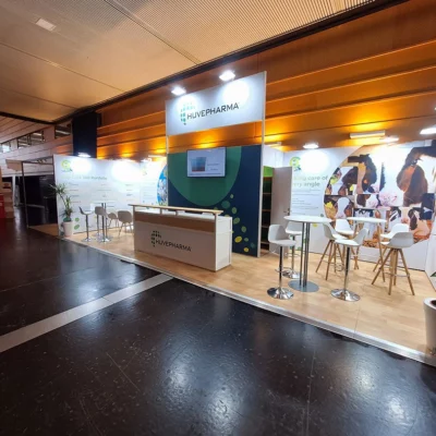 27 m² stand created for Huvepharma at the Journées Nationales des GTV in Nantes: raised wooden floor, XXL visuals, video screen, central counter and exchange areas.