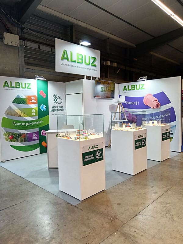 We are present as stand builder with the ALBUZ booth at Sitevi in Montpellier. This is the international trade show for the viticulture, viniculture, arboriculture and olive-growing sectors. The 16m² stand opens onto a corner. The stand has 3 cubic display cases to showcase ALBUZ equipment. For show information, visit the SITEVI website. Don’t hesitate to entrust us with your stand project in Montpellier. With experience as a stand builder since 1989, we can handle every stage of your participation in a trade show, from design, manufacturing and logistics to the installation of your stand in the exhibition hall. To arrange your furniture on the stand, consult our catalog.