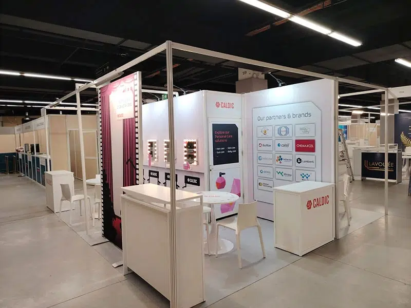 CALDIC’s customized booth at COSMETAGORA Paris: Octanorm frames and fabric graphics for an elegant, optimized look.