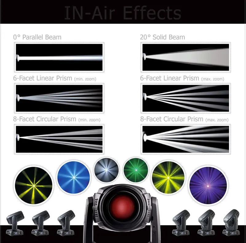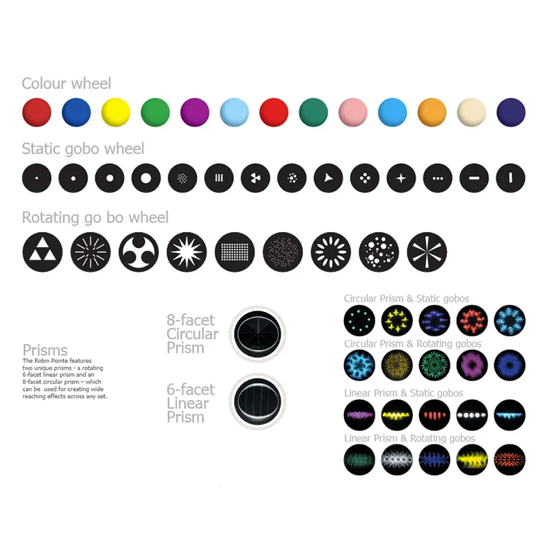 EFFECTS : rotating and static gobo wheel, 6-facet prism, 8-facet circular prism and linear prism
