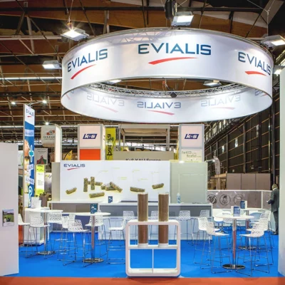 Stand EVIALIS de 72 m² réalisé par adEXPO au Sommet de l’Élevage à Clermont-Ferrand : ouvert sur 2 angles avec couronne élinguée, visuels grand format et totems lumineux rétroéclairés.