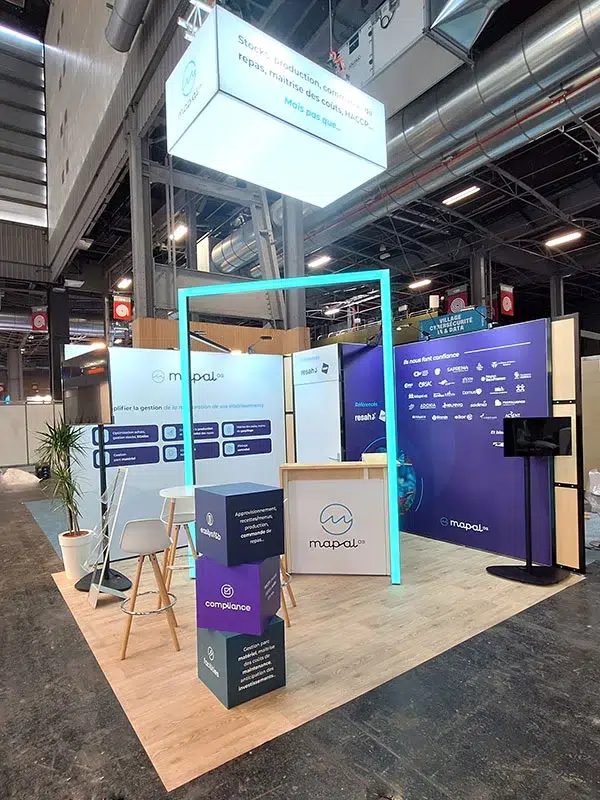 Pour attirer l’attention dès les premières allées, un cube rétroéclairé se positionne en hauteur. Portant le logo Mapal et un message clair, il assure une excellente visibilité à distance, un point clé dans un grand salon comme SANTEXPO.