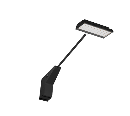 Son design élégant et discret repose sur une tige fine et épurée, avec une tête inclinable permettant un ajustement précis de l’angle d’éclairage. Intégrant un transformateur 220V, il est simple à installer et immédiatement fonctionnel. Disponible en gris ou noir, il s’adapte parfaitement à tous types de stands et d’aménagements.