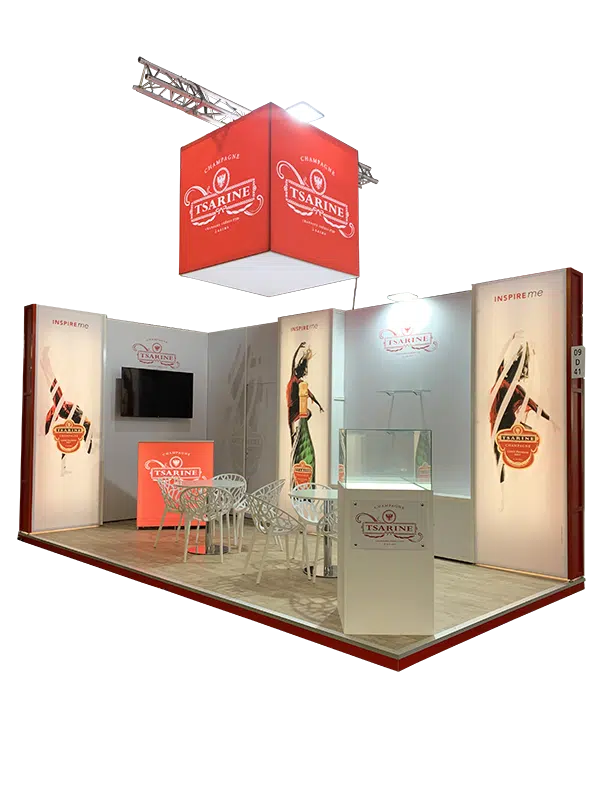 Stand du Champagne Tsarine sur plancher de 18m² au salon Prowein. Il s’ouvre sur un angle. Standiste et spécialiste dans la conception de stand, nous avons mis un plancher Octanorm qui permet le passage des fluides et met en valeur l’ensemble du stand. L’élingage de l’enseigne haute donne une grande visibilité de la marque dans le hall. C’est une enseigne lumineuse sur 4 faces. N’hésitez pas à nous confier votre projet, notre équipe connait bien ce salon, nous y travaillons depuis de nombreuses années. Voir les informations du salon.
