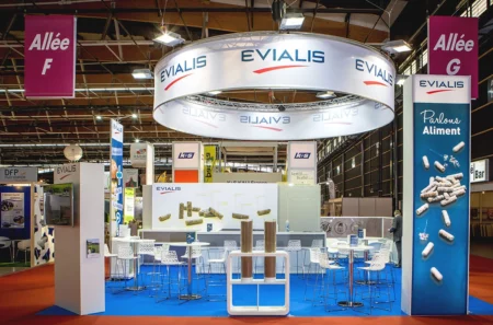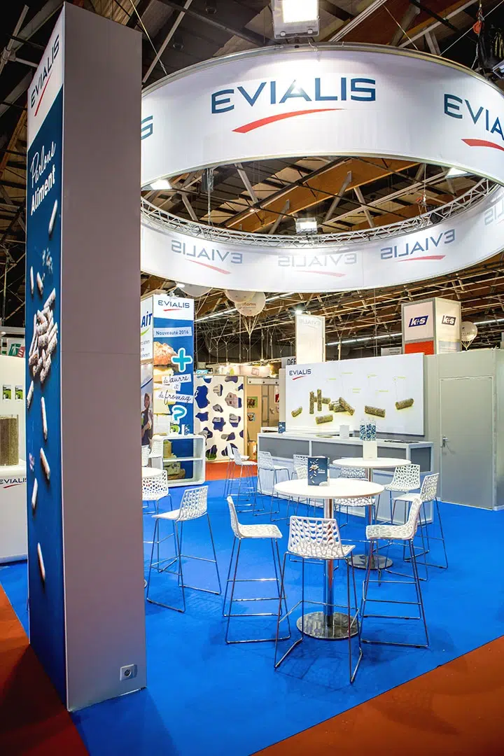 La communication visuelle repose sur des grands visuels imprimés et des totems lumineux (caissons rétroéclairés) qui valorisent la marque et les produits EVIALIS auprès des visiteurs professionnels du salon.