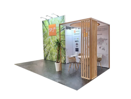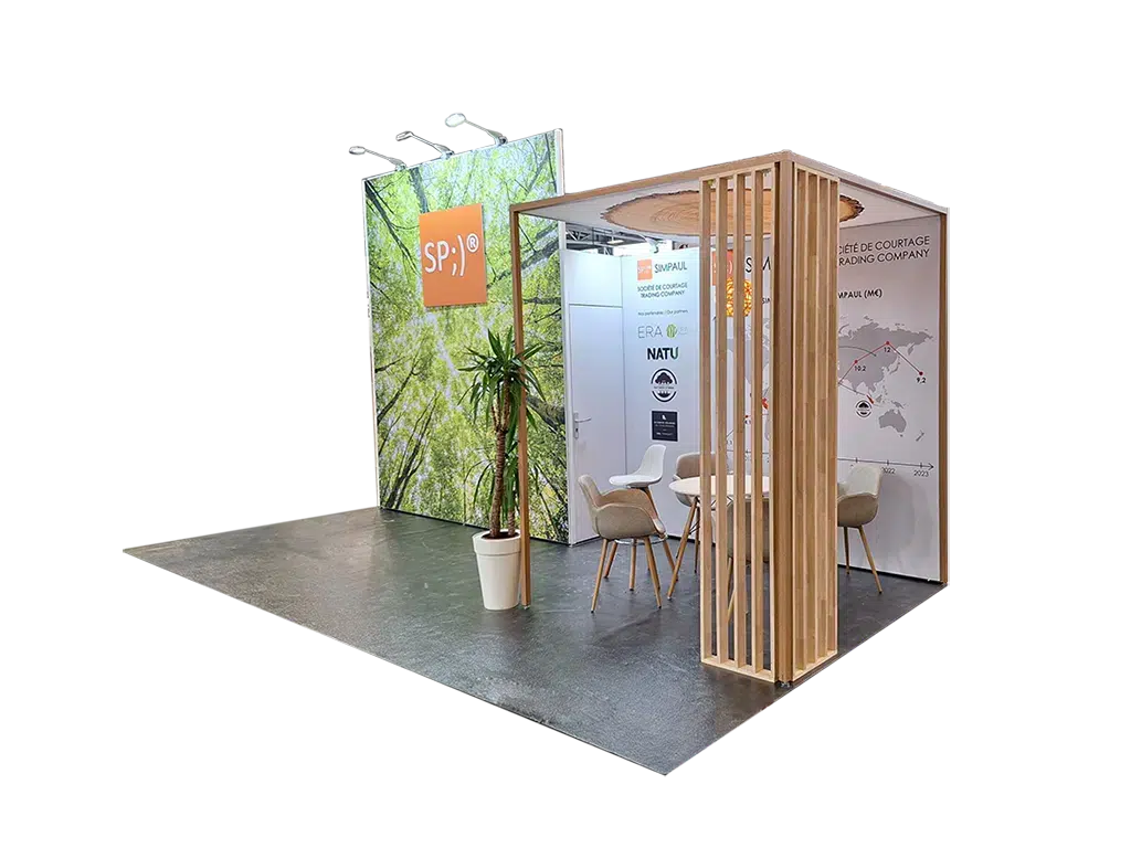 Simpaul, fabricant de produits bois pour l’extérieur, fabricant de panneaux massifs et aboutés en chêne, hêtre, frêne, fabricant carrelets huisserie hêtre, fabricant carrelets exotiques KKK et fabricant de meubles. La conception du  stand Simpaul a été fait par adEXPO, standiste, pour le Carrefour international du bois à Nantes. Le stand a un espace de 18 m² ouvert sur 2 angles. Il se remarque par son grand visuel de 3m50. Un espace salon a été aménagé par des claustras ajourés représentatifs des matériaux que commercialisent le client. Le mobilier est visible en détail sur notre catalogue. Nous remercions notre client pour sa confiance pour la conception de son stand à Nantes.