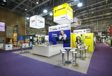 Le stand Zeelandia au SIRHA Lyon, conçu par <strong data-start= »1804″ data-end= »1830″>Expovorm International et réalisé par adEXPO, se distinguait par son cube lumineux suspendu arborant le logo de la marque sur un fond jaune et blanc. Ce stand ouvert sur deux angles, avec sa moquette grise et ses couleurs bleu et blanc, offrait une visibilité optimale aux visiteurs.